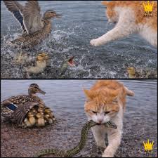 At first glance, the scene looks tense: a cat sits on the edge of a wooden dock while a group of tiny ducklings gather nearby, dangerously close…