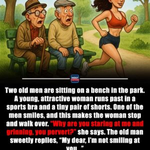 Two old men settle into their usual park bench, trading the same easy jokes they’ve shared for years, when a young woman in bright running shoes and…