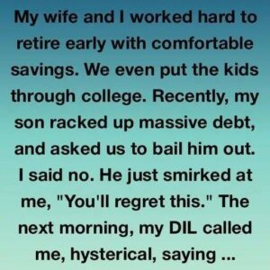 After retiring comfortably, my wife Marta and I refused to bail out our 32-year-old son when he racked up massive debt. He smirked and said we’d regret…