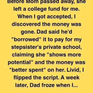 Before my mom passed away, she left a college fund in my name. The day I got accepted, I found out it was gone. My dad had…