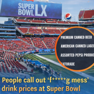 Super Bowl fans at Levi’s Stadium are furious over concession prices, with $17.50 for canned lager or Bud Light Seltzer, $19 for premium beer, $16 for canned wine, and $8 for water. Social media users are calling it a “f***ing mess,” though some note these prices match regular-season games. With tickets costing $4,000–$6,000 or more, many fans say expensive drinks feel inevitable and plan to drink at home instead.